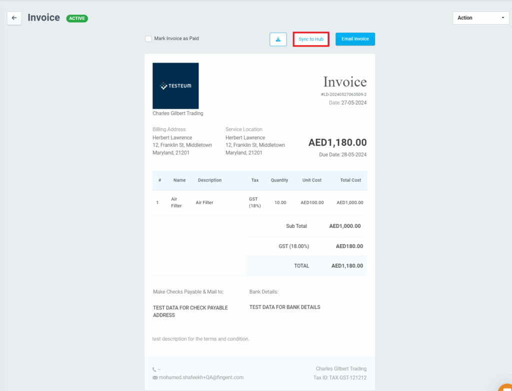 - Tick the Sync to Customer Hub option while sending the invoice to the customer.