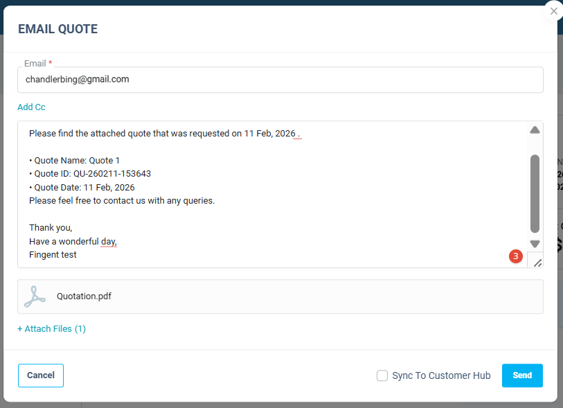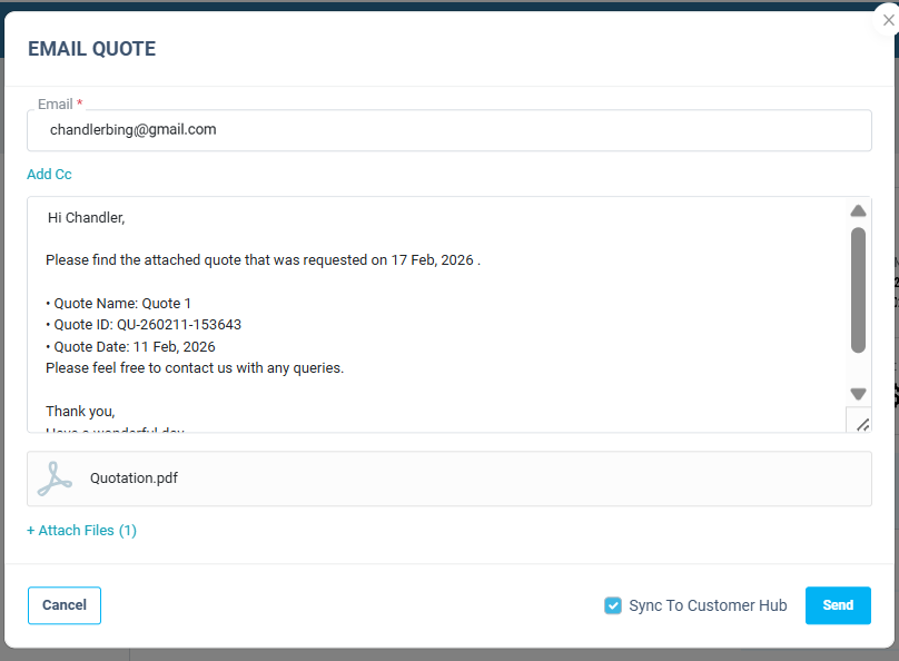 - Tick the Sync to Customer Hub option while sending the quote to the customer.