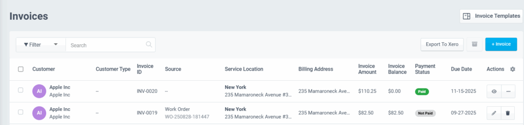 You can view the generated invoice and download it from the invoices home. The invoice source (Quote, Work Order/Inspection, Other) details will be displayed.