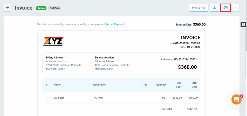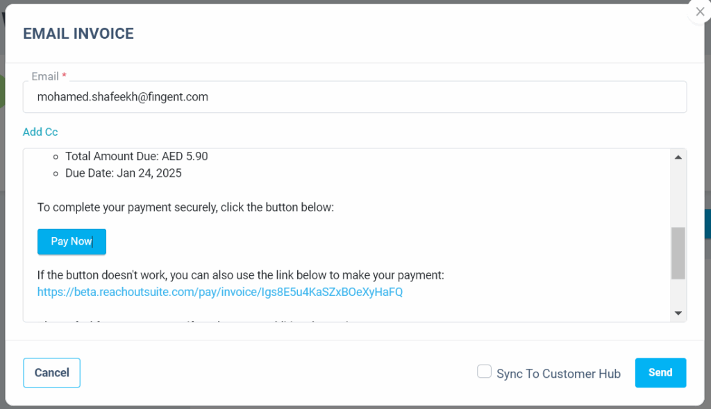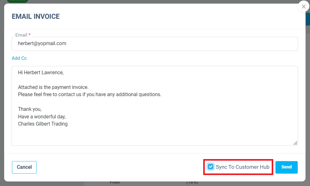 - Tick the Sync to Customer Hub option while sending the invoice to the customer.