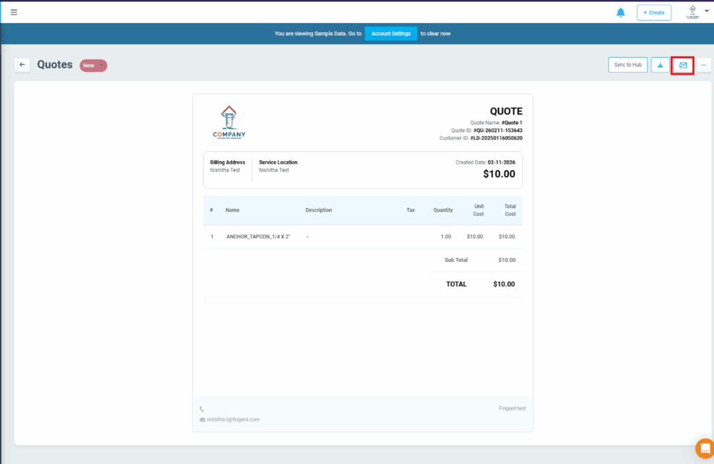 - Tick the Sync to Customer Hub option while sending the quote to the customer.