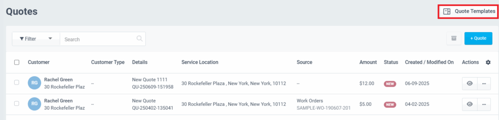 1. Navigate to – Main Menu > CRM > Quotes and click the Quote Templates button