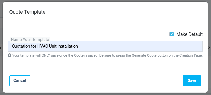 1. Enter a name for the template. Check the Make Default option if you need it to be the standard template for all your quotes. Click the Save button.
