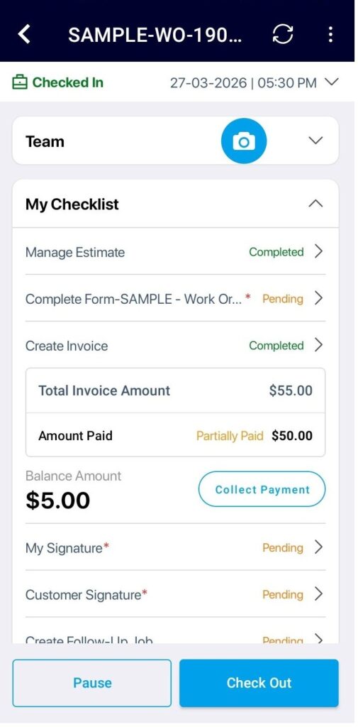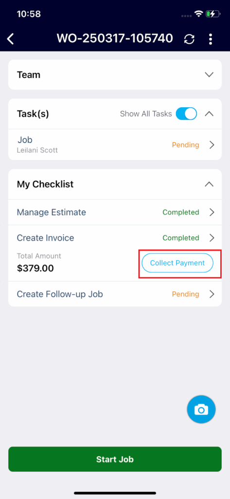 - Click the Collect Payment button from the My Checklist section. The Collect Payment option will be enabled once the invoice is complete.