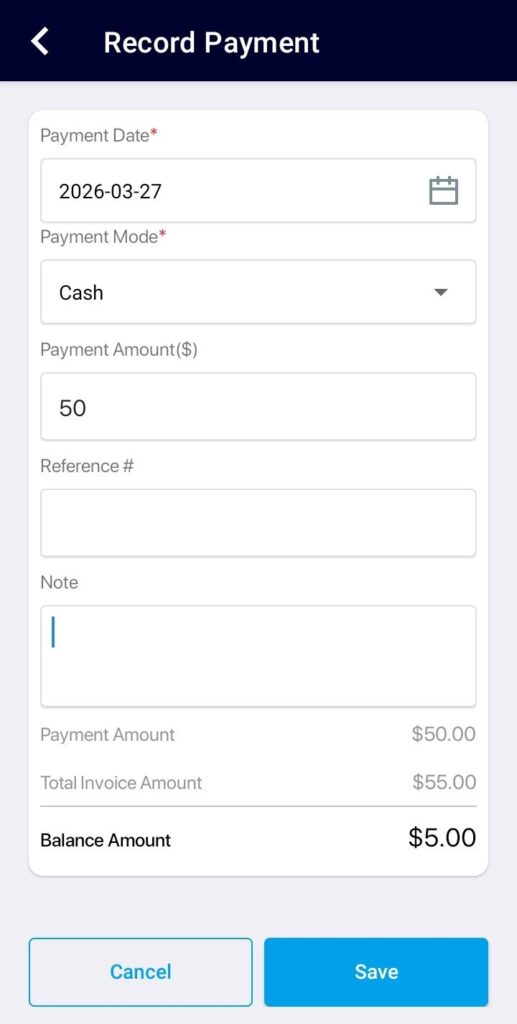 - Tap on the Collect Payment button and choose an option from Cash, Check, ACH, Bank Transfer, or Other.